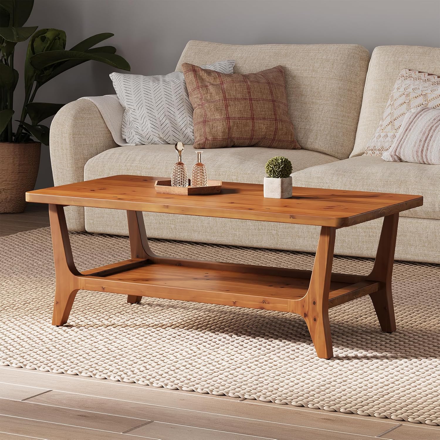 47-Inch Solid Wood Coffee Table with Shelf – 2-Tier Center Table for Living Room, Brown
