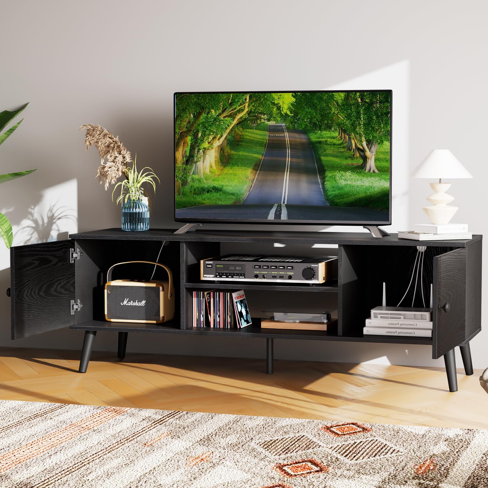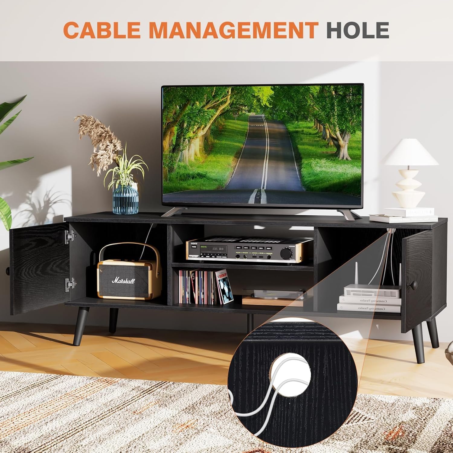 Modern Mid-Century TV Stand for 55–60 Inch TVs – Entertainment Center with Storage Cabinets and Adjustable Shelves, Pure Black